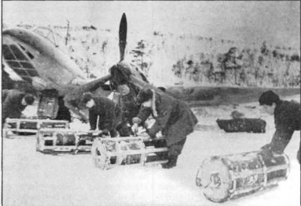 Бомбы в упаковке подкатывают к Пе-2, Северный флот, зима 1941-42 годов.