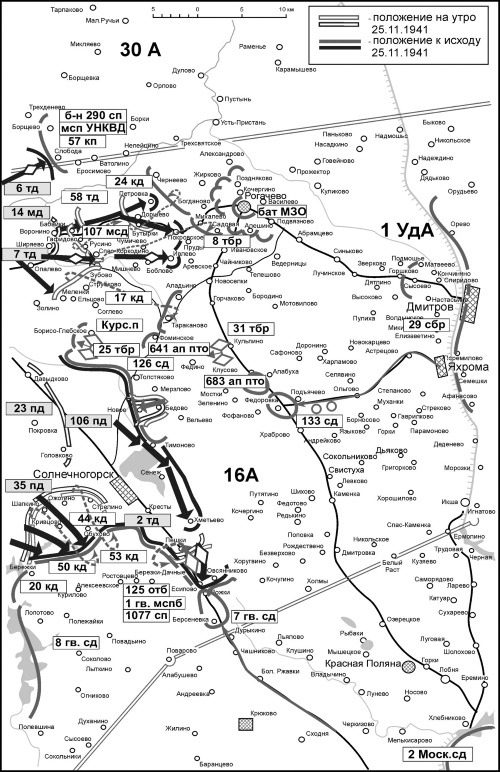 Подход подкреплений в 16-ю А (кроме 133-й сд в на Ленинградское шоссе в район д. Ложки прибыла 7-я гв. сд) настолько воодушевил командующего Западным фронтом, что он потребовал от 30-й и 16-й армий немедленно организовать наступление для освобождения Клина и Солнечногорска[90]. Как заметил К. Клаузевиц, «энергия, когда она у места, является в высшей степени важным элементом ведения войны». Однако в данном случае одной энергии командующего оказалось недостаточно, и этот приказ Г.К. Жукова оказался слишком оптимистичным. Враг владел инициативой, и наши войска пока, в лучшем случае, успевали только парировать его удары. До широкомасштабного наступления дело не дошло.