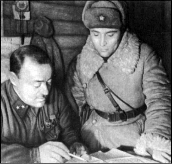 Ф.Д. Захаров и А.В. Чапаев – сын легендарного начдива,(командир противотанкового дивизиона 511-го ran 133-й сд в период боев на Рогачевском шоссе). Фотография сделана в начале 1942 г.