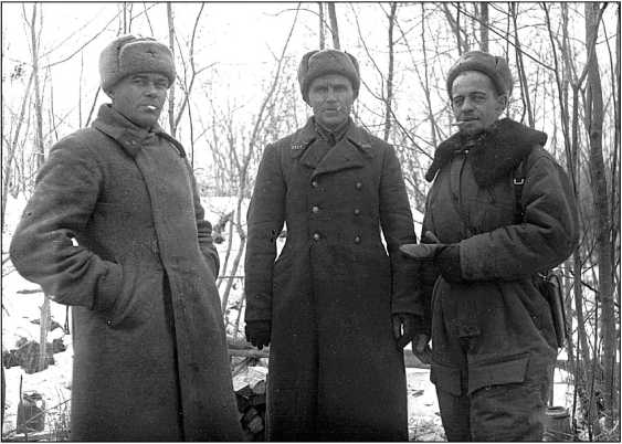 Командование 418-го сп 133-й сд. Слева направо: комиссар Гордеев, командир полковник Мультан, командир группы поддержки пехоты (511 ran) капитан Портянников.