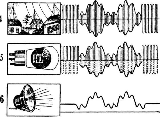 Процесс радиоприема: 4 — антенна радиоприемника принимает колебания, отправленные передающей радиостанцией. 5 — детекторная лампа выделяет звуковые колебания из принятых колебаний высокой частоты. 6 — звуковые электрические колебания приводят в действие громкоговоритель.