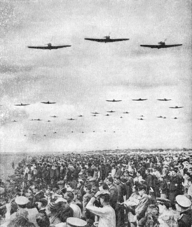 Гигантский аэродром выглядит празднично. В воздухе — неумолчный говор, оживленные восклицания, праздничный гул.