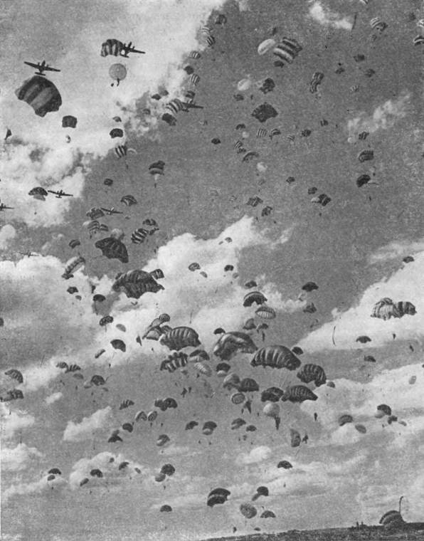 Над аэродромом проходят десятки транспортных самолетов. Они высаживают десант из нескольких сот человек. Небо расцветает от многоцветных парашютов, образующих радужный фейерверк.
