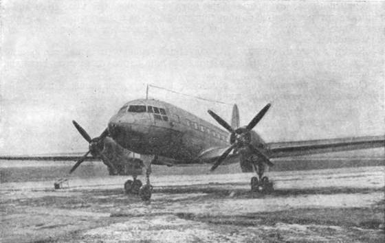 Так же как и «Ил-12», этот огромный четырехмоторный самолет оборудован всеми новейшими приборами, обеспечивающими полет в любых метеорологических условиях, в любое время дня и ночи. Очень интересно разрешена здесь проблема безопасности полета в условиях, грозящих обледенением: отработавшие в моторах газы используются для обогревания передней кромки крыла, подвергающейся обледенению.