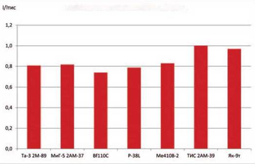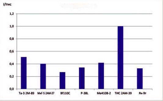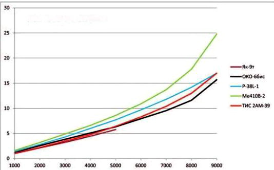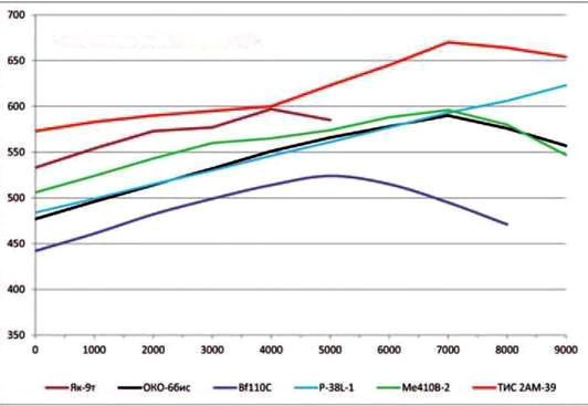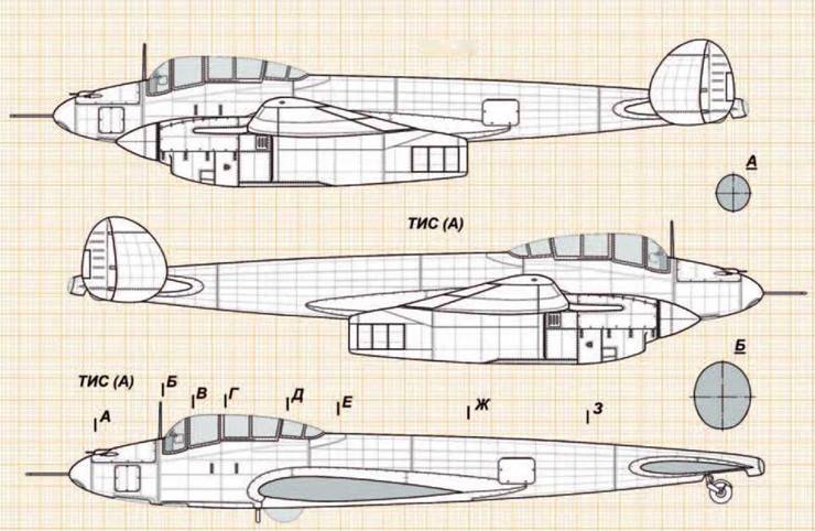 Параметр ТИС ЭП з-д №51 9.1940 г. ТИС ТТТ НИИ ВВС 12.1940 г. ТИС ЭП 3-д №51 12.1940 г. ТИС опытный 3-Д №51 5.1942 г. ТИС ЭП з-д № 51 12.1943 г. ТИС опытный з-д №51 95-09.1944Г. ВИ-100 опытный з-д № 39 5.1940г, Та-3 опытный 3-д №483 07.1941 г. МиГ-5 опытный 3-д № 1 7-10.1941 г. ДИС-135 ЭП з-д№ 135 10.1940 г. Пе-Збис опытный з-д № 39 10.1941 г. Bf110C серийный НИИ ВВС 1940 г. Ме410В-2 серийный НИИ ВВС 4-5.1945 г. P-38L серийный НИИ ВВС 04.1947 г. Пе-2И(ОД опытный з-д №22 7-10.1944Г. Пе-2И (ДИС) ЭП 3-д №22 4.1944 г, ДИС 2М-107А ЭП 3-д №482 8.1945 г. «63/2» опытный з-д 5.1945 г. «68» опытный 3-д№ 156 8.1945 г. Число членов экипажа 2 2 2 2 2 2 3 1 1 1 2 2 2 1 2 2 2 3 4 Количество моторов 2 2 2 2 2 2 2 2 2 2 2 2 2 2 2 2 2 2 2 Тип мотора АМ-37 - АМ-37 АМ-37 АМ-39 АМ-38ф М-105ТК-2 М-89 АМ-37 АМ-37 М-105р DB601A DB603A-1 V-1710-111(113) М-107А М-107А М-107А АМ-39Ф АМ-39ФНВ Мощность взлетная, л.с. 1400 - 1400 1400 1750 1700 1100 1300 1400 1400 1100 1175 1750 1475 1650 1650 1650 1800 1860 Мощность номинальная, л.с. 1200 - 1200 1200 1500 1500 1050 1150 1200 1200 1050 1150 1510 1425 1550 1550 1550 1550 1560 Длина самолета, м 11,5 - 11,7 11,7 11,7 11,7 12,446 9,827 11,2 11,6 12,665 12,07 12,48 11,525 13,78 13,78 13,795 13,585 13,8 Размах крыла, м 15,0 - 15,5 15,5 15,5 15,5 17,150 12,658 15,3 16,8 17,13 16,23 16,38 15.85 17,175 17,175 17,80 18.86 18,86 Площадь крыла, м² 33,0 - 34,85 34,85 34.85 34,85 40,7 25,5 38,9 39,8 40,5 38,4 36.43 30,44 41,8 41,8 43,8 48,8 48,8 Вес пустого, кг 4984 - 4984 5800 6027 6261 5887 4584 5638 5217 5808 5020 7520 6204 7080 6568 7045 7800 8548 Полетный вес, кг 7000 - 6976 7840 8150 8280 7200 6000 8063 7250 8040 6510 10410 8252 8983 8229 9850 10925 11370 Нагрузка на крыло, кг/м² 212,12 - 200,17 224,96 233,86 237,59 176,90 235,29 207,28 182,16 198,52 169,53 285,75 271,10 214,90 196,87 224,89 223,87 232,99 Нагрузка на мощность,кг/л.с. 2,50 - 2,49 2,80 2,33 2,44 3.27 2.31 2,69 2,59 3.65 2.77 2,97 2.80 2,72 2,49 2,98 3,03 3,06 Весовая отдача (вес нагрузки / к полетному весу),% 28,56 - 28,56 29,56 26,05 24,38 18,24 23,60 30,08 28,04 27,76 22,89 27,76 24,82 21,18 20,18 28.48 28,60 24,82 Максимальная скорость, км/ч у земли 500 531 490 573 514 455 460 484 532 448 442 506 514 556 542 533 547 520 на высоте/м 628/8000 630/7000 650/7300 575/7400 670/7150 530/4000 535/6000 580/7100 610/6800 659/7200 530/5300 525/4600 600/6750 623/9000 656/5650 640/5850 626/5800 640/6850 635/7100 Посадочная скорость, км/ч 139 135-140 135 150 147 139 172 140 141 115** 147,0 130 160 152 146 140 140 - - Время набора высоты 5000 м, мин - 10,2/8000 5,7 7,3 6.4 8,0 6.8/4000 7,7 7,4 5,42 10,2 8,4 8,6 7,7 7,0 6,6 7,1 8,70 11,1 Время виража на 1000 м, с - 20-22 - - 23,4 - 41,4/3000 22,3 24,0 20-22 32 30,0 - 22,5 29,5 - - 30,1 30,7 Дальность полета, км 1260/2230 2000 1070/1720 - 2000 - 1400/2400 1060 1480 1686 2150 800 - 1865/1000 2275 - 3700/4000 1530 1660 Длина разбега при взлете, м - 450 433 - 485 - 380 450 - 389 467 370 730 500 650 430 550 535 635 Длина пробега при посадке, м - 300 236 - - - 435 420 - 270 500 340 1000 680 790 410 - - - Наступательное вооружение бомбовое: нормальное / в перегрузку, кг /400 /1000 /1000 /1000 /1000 /1000 /1000 /500 /1000 /700 /2200 /1816 500/1500 /500 /1000 1000/2000 1000/2000 стрелково-пушечное: число/калибр, мм 1)2x20, 2x12,7 2) 2x37, 4x7.62 2x20, 2x12,7, 4x7,62 2x20, 2x12,7, 4x7,62 2x20, 2x12,7, 4x7,62 2x45, 2x20 2x37,2x20 2x20, 2x7,62 4x20, 2x7,62 1x23, 2x12,7, 4x7,62 1)2x23, 4x7,62 2) 2x20, 4x7,62 1x20,2x12,7 2x20,4x7,92 1x50,2x20, 1x13 1x20,4x12,7 1x12,7 1x20,2x45 2x20,2x45 2x20 2x20 ракетное: число/калибр, мм - - - - 8x132 8x132 - 4x82 - 6x132 - - - 10x127 - - - - - Оборонительное вооружение: число/калибр, мм 1x7,62 2x7,62 2x7,62 2x7,62 1x12,7 1x12,7 1x7.62*** - - - 1x12,7 1x7,92 2x13 - 1x12,7 1x12,7 1x20 2x12,7 3x12,7 Секундный залп наступательного стрелково-пушечного вооружения, кг/с 1)4,3; 2) 6,8 5,31 5,31 5,31 11,52 8,77 3,24 5,88 4,63 1)5,12; 2) 3,84 2,79 3,10 4,82 3,95 0,74 10,20 11,52 2,64 2,64** В перегрузку.