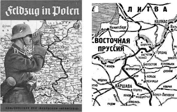 Возможно фальсификаторы из американской разведки, фантазируя насчет передачи Советским Союзом части территории Литвы Германии, пользовались образцами германской пропаганды. Плакат слева действительно создает впечатление, будто Германия отхватила у Литвы маленький кусочек на ее юго-западной окраине. Увеличенный фрагмент карты, опубликованной в газете «Известия» показывает, что юго-западная граница Литвы осталась неизменной, а Сувалки находятся на территории Польши (граница Польши оттенена толстым заштрихованным абрисом). Если же верить в существование «секретных протоколов», то выходит, что немцы опубликовали «секретную» карту, еще не дождавшись, когда СССР оккупирует Литву и отдаст Германии ее кусок ради «выпрямления» границы. На самом деле красная линия обозначает лишь изменение границ рейха, и не более того.