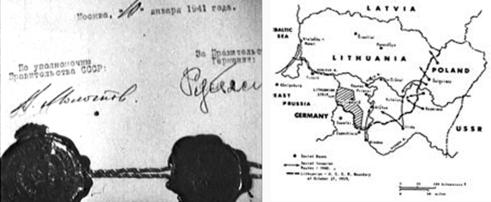За два дня до ультимативно навязанного Советским Союзом Литве 10 октября 1939 года Договора о взаимопомощи с правом введения ограниченных контингентов Красной Армии, В.М. Молотов сообщил телеграммой от 8 октября послу Ф. фон В. Шуленбургу, что при размещении частей Красной Армии в Литве т. н. треугольник Сувалки не будет оккупирован. Но, поскольку передача этой, оговоренной во втором секретном протоколе, части территории Литовской Республики Германскому Рейху могла вызвать определенные политические трудности, новым секретным протоколом от 10 января 1941 года текст предыдущего секретного протокола (от 28 сентября 1939 г.) был изменен и т. н. треугольник Сувалки перешел к Советскому Союзу за компенсацию в размере 7 500 000 золотых долларов»[135].