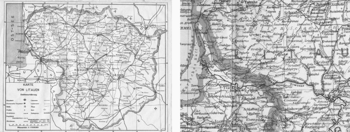 Справа: так официальный Каунас видел Великую Литву в 1920–1938 гг. Слева: На германской карте 1935 г. мы видим, что Мемельская область обозначена как часть территории рейха. Вильно немцы признавали за Польшей.