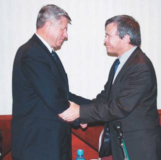 Об этом стало известно 3 марта, когда в московском «Мариотт Гранд Отеле» состоялось торжественное подписание соглашения между французской фирмой «Снекма Моторс» (Snecma Moteurs) и российским Летно-ис- следовательским институтом (ЛИИ) им. М.М. Громова о создании летающей лаборатории для проведения летных испытаний нового двухконтурного турбореактивного двигателя SaM-146, совместно разрабатываемого для перспективного регионального пассажирского самолета RRJ «Снекмой» и НПО «Сатурн» в рамках созданного в 2004 г. совместного предприятия «Пауэрджет» (PowerJet). С французской стороны соглашение подписал генеральный директор фирмы «Снекма» по гражданским двигателям Жан-Пьер Кожан (Jean Pierre Cojan, на снимке – справа), с российской – генеральный директор ЛИИ Юрий Клишин (слева).
