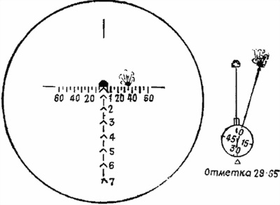 149. Корректура по боковому направлению может быть введена отметкой по разрыву гранаты (рис. 50). Для этого после выстрела (очереди) восстановить наводку гранатомета, заметить, против какого деления шкалы боковых поправок сетки прицела разорвалась граната, и этим делением прицелиться для следующего выстрела или, вращая барабанчик угломера, отметиться по разрыву и для следующего выстрела навести гранатомет в цель с новой установкой угломера, полученной после отметки по разрыву.