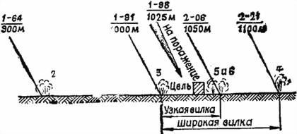 Ширину первой (широкой) вилки берут равной 100 м, а узкой — 50 м. В зависимости от наблюдения величины отклонения разрывов от цели ширина первой вилки может быть уменьшена или увеличена.