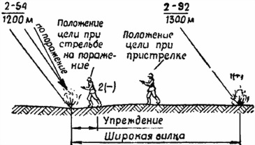 164. При расположении цели на гребне высоты или вблизи него пристрелку начинают с расчетом получить первые наблюдения — недолеты; затем, изменяя установки прицела скачками в 50 или 100 м; захватывают цель в вилку.