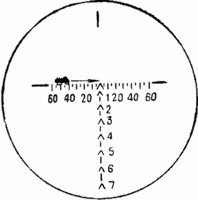 Для определения расстояний по формуле «тысячной» необходимо знать линейные размеры целей (местных предметов) и измерить их угловую величину в тысячных. Измерение угловой величины целей (местных предметов) производится сеткой бинокля, барабанчиком или сеткой прицела. При этом необходимо учитывать, что высота верхнего (большого) угольника сетки прицела равна 0-05; высота большого штриха шкалы боковых поправок 0-03, а малого — 0-02.