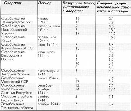 Межармейское и межокружное маневрирование средствами полевого ремонта позволило в период боевых операций, сопровождающихся большим отходом матчасти в ремонт, иметь процент неисправных самолетов в значительной части соединений, участвующих в операциях, ниже пределов, установленных ГКО. Это наглядно видно из приведенной таблицы 2.