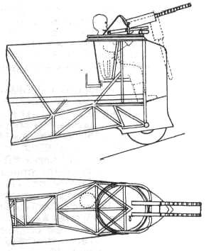 Следовало бы сделать одно костыльное колесо, поместив его сзади второго стрелка, что одновременно предохраняло бы заднего стрелка от ударов о землю.