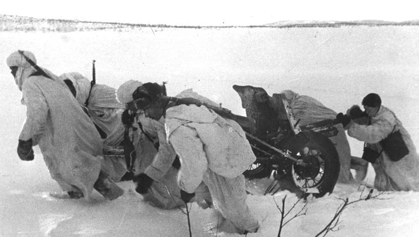 Расчет, впрягшись в лямки, сменяет позицию. Командир орудия (с биноклем) «висит» на стволе, чтобы уравновесить массу станин.