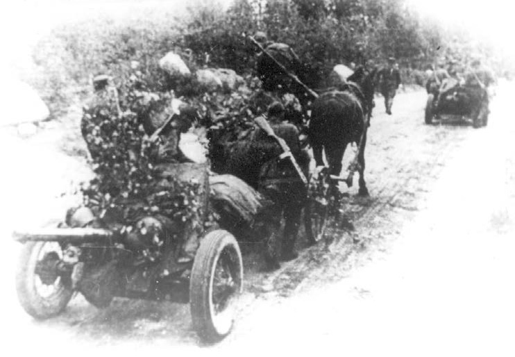 Мы начали отходить группой и видели, как по ходу нашего движения, в лощине слева, от танка пыталась уйти упряжка с 76-мм пушкой, однако была раздавлена вместе с расчетом. Нас накрыл огонь артиллерии, и снаряды начали рваться совсем близко. Был ранен начальник штаба батальона, и мы с шага перешли на бег, перемещаясь от укрытия к укрытию. Прятались за домами и деревьями, в кюветах вдоль дороги.