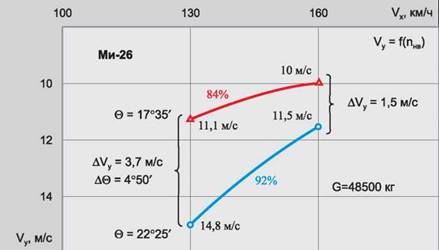 Увеличение посадочной скорости у Ми-26 по сравнению с Ми-6 объясняется большими значениями вертикальной скорости установившегося планирования и меньшей эффективностью торможения. Уменьшение эффективности торможения и «подрыва» для вертолета Ми-26 является следствием большего коэффициента заполнения s и меньшего значения g.