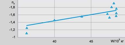 Рис. 3. Зависимость вертикальной перегрузки при посадке на режиме авторотации вертолета Ми-26 от полетной массы
