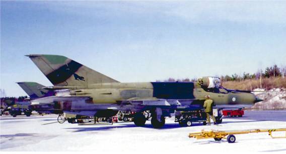 На снимке в центре — МиГи 21бис на стоянке полка, внизу — МиГ 21УМ МК105 готовится к очередному тренировочному вылету Фото С Цветкова