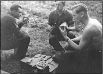 Экипаж Альфреда Руббеля обедает и наслаждается теплыми днями. Йохан Штромер, Вальтер Эшриг и Альфред Руббель (самый правый).