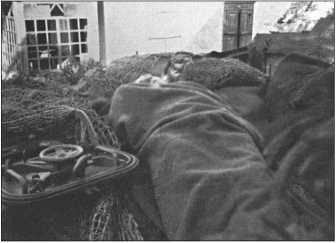 Командир 1-й роты, Ханс-Юрген Бурместер, спит, завернутый в шерстяное одеяло, на маскировочной сети в качестве матраса на своем «Тигре» сном праведника. Начиная с июля 1943 года он много недель командовал всем батальоном.