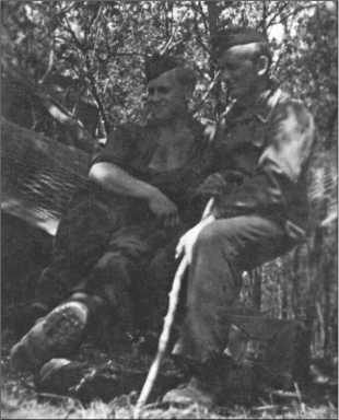 Главный водитель Вальтер Мартах и унтер-офицер Поль Томе сидят в гамаке.