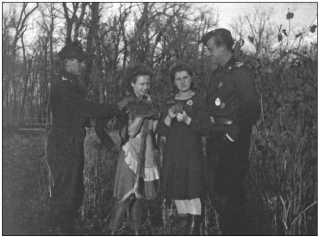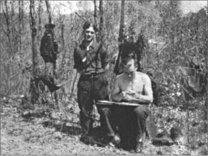 Хотя в лесу у Толоконое на деревьях еще нет листьев, солнце уже пригревает. Альфред Руббель с планшетом с картами, рядом с ним стоит товарищ Вальтер Юнге.