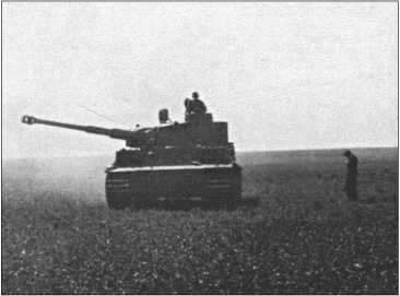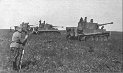 «Тигр» 2-й роты 503-го тяжелого танкового батальона готов продемонстрировать гостям точную стрельбу из пушки «Тигра». Генерал-фельдмаршал Эрих фон Манштейн наблюдает за результатами стрельбы в стереотрубу.