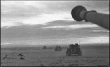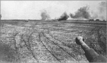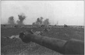 Эта фотография была сделана во время боя в битве на Курской дуге. Вид от ствола 8,8-сантиметровой пушки к горизонту, где видны многочисленные разрывы артиллерийских снарядов. На переднем плане видны еще «Тигры» и Танки IV, идущие в бой.