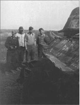 Херберт Бёме, унтер-офицер Риппль, Биндер и еще один товарищ из 1-й роты 503-го тяжелого танкового полка осматривают подбитый Т-34. Один из катков Т-34 разбит попаданием снаряда.
