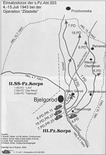 Три «тигровых» роты 503-го тяжелого танкового батальона во время операции «Цитадель» были разделены и подчинены трем различным танковым дивизиям для усиления. Вместе с этими танковыми дивизиями они пошли в бой.