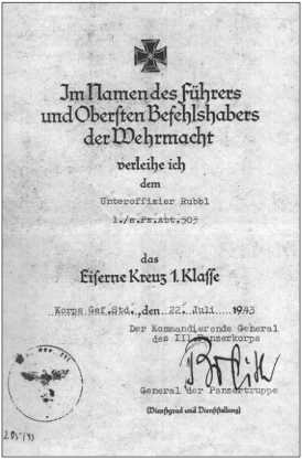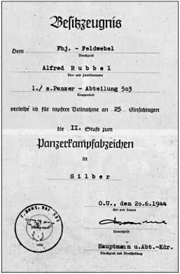 Унтер-офицер Альфред Руббель вскоре после Курской битвы был награжден Железным крестом 1-го класса. К сожалению, на свидетельстве о награждении его имя написано неправильно. Свидетельство о награждении подписано генералом, командующим 3-м танковым корпусом Херманном Брайтом.