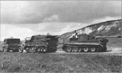 114-го «Тигра» тащат на прицепе два 18-тонных тягача Фамо. «Тигр» соединен с тягачом тягой. Первый тягач соединен со вторым стальным тросом.