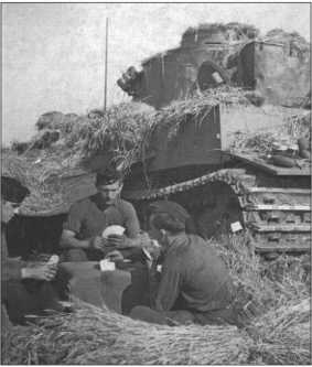 «Тигр», замаскированный соломой, его экипаж перед ним играет в скат. Солдат посередине — это Ханс Вельш.