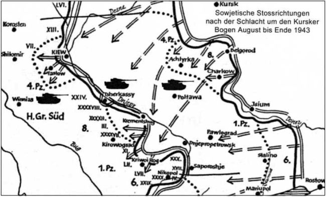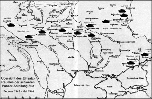 Районы боевых действий 503-го танкового батальона на Украине между августом и концом 1943 года.