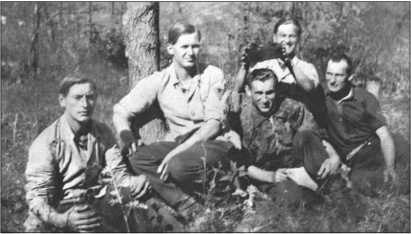Экипаж 114-го «Тигра» в маленьком леске. Слева направо: водитель Вальтер Эшриг, радист Альфред Пойкер, командир танка Альфред Руббель, наводчик Вальтер Юнге держит «корону» над Альфредом Руббелем, и заряжающий Йохан Штромер.