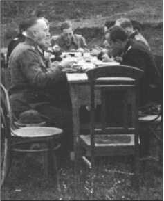 Офицеры батальона за совместной едой. Во главе стола граф фон Кагенек, слева впереди главный ремонтник Нойберт, известный специалист по техническому устройству «Тигра». В мае 1944 года он был награжден редким Рыцарским крестом Креста за военные заслуги.