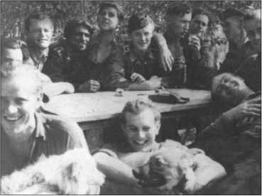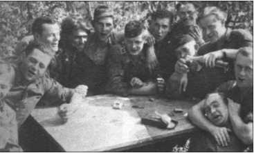 Праздник в 1-й роте 503-го тяжелого танкового батальона по случаю награждения Хайно Кляйнера Железным крестом первого класса в Знаменке осенью 1943 года. Трое на переднем плане слева направо: Хёрнке, Биндер и Вольфф. Сзади за столом слева направо: Риппль, Фендезак, Книспель, Кляйнер, Тессмер, Руббель, Юнге, Эрдманн и Бузе.