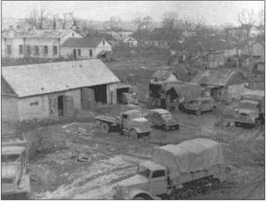 Вид с крыши дома в Таврове на часть автомобильного парка ремонтной роты батальона. Кроме грузовиков «Богвард» и «Фольксваген-Кубельваген» снизу справа еще виден «Форд-Мул», у которого вместо задней оси была простая гусеничная ходовая часть. В украинской грязи они были гораздо лучше, чем обычные колесные грузовики.