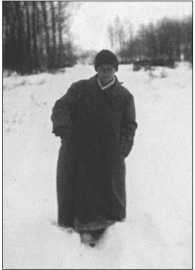 Альфред Руббель на покрытой глубоким снегом лесной дороге.