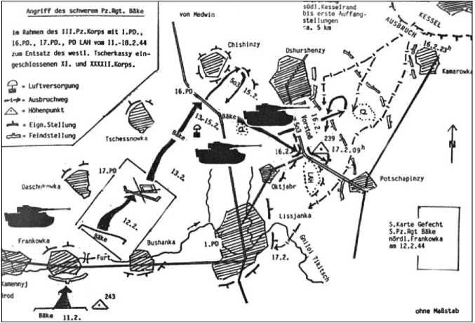 Танковый полк Беке должен был стать бронированным кулаком во время решающих боев. Но первый бой этого полка ничего общего с котлом под Черкассами не имел. Во время наступления на север в направлении Медвин 3-й танковый корпус, которому подчинили наш полк, должен был разбить три русских корпуса, которые наступали с севера. Это не удалось по причине трехкратного превосходства русских. Во время этой бессмысленной операции, на которую были потрачены силы и время, 28 января 1944 года были окружены 11-й и 42-й корпуса. Теперь 3-й танковый корпус отвели на 30 километров назад для прорыва кольца окружения у Черкасс при жесточайшей нехватке времени. 3-й танковый корпус под командованием генерал-лейтенанта Брайта имел приказ силами 1, 16 и 17-й танковых дивизий, танковой дивизии СС «Лейбштандарт», 198-й пехотной дивизии и тяжелого танкового полка Беке деблокировать котел у Корсуня — Черкасс, в котором оказались 11-й и 42-й армейские корпуса.