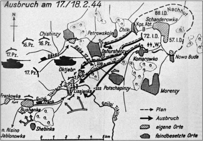 Набросок карты прорыва окруженных немецких частей в котле под Черкассами, который удался, но прошел с большими потерями.
