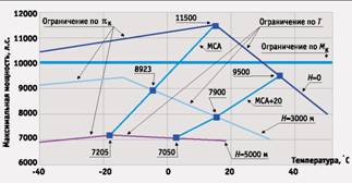 Рис.7. Изменение максимальной взлетной мощности двигателя Д-136 в зависимости от температуры и высоты