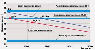 При заданной для JTR высоте 1219 м и при температуре, на 20° превышающей стандартную, без обеспечения вертикальной скороподъемности 2, 54 м/с взлетная масса вертолета Ми-26 составляет всего 45,87 т – т.е. на 4 т меньше нормальной взлетной массы. Это существенно снижает транспортные возможности вертолета (рис. 10).