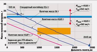 Рис.1 свидетельствует, что если возможно создать летательный аппарат, способный перевозить стандартный контейнер и имеющий перегоночную дальность полета 3890 км, то такой аппарат будет обеспечивать максимальные значения требований к JTR по полезной нагрузке и дальности полета с ней.