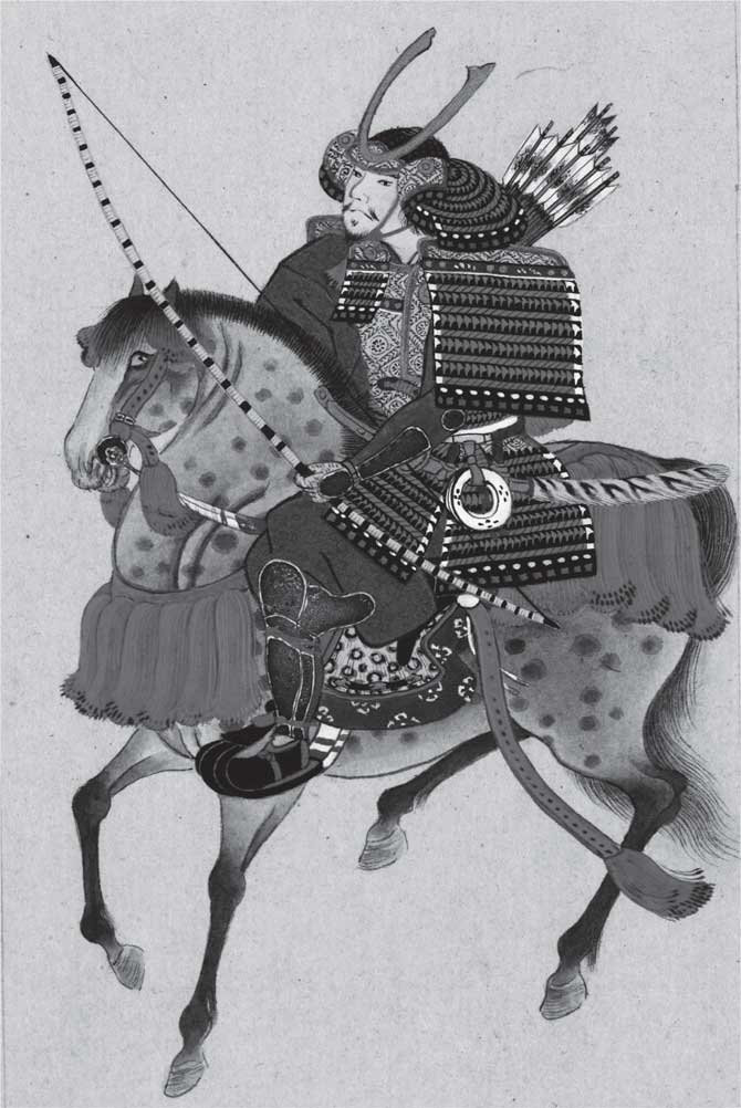 Самурай верхом в доспехах и шлеме. Рисунок неизвестного художника