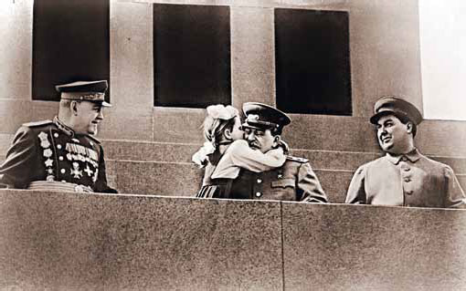 Маленков, Сталин с девочкой Верой, Булганин на трибуне Мавзолея. Москва, 1952 г.