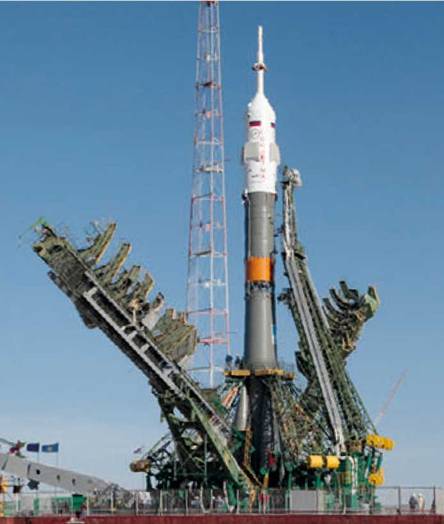 Ракета-носитель «Союз-ФГ» с пилотируемым космическим кораблем «Союз ТМА-10М» за два дня до старта. Байконур, 23 сентября 2013 г. Слева: экипаж «Союз ТМА-10М», сверху вниз – бортинженеры Сергей Рязанский и Майкл Хопкинс, командир корабля Олег Котов