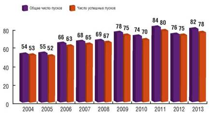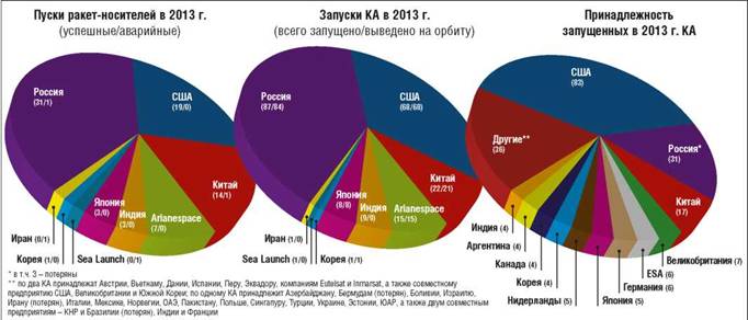 В 2013 г. в мире стартовали 82 ракеты- носителя (РН) космического назначения, на 6 (или 9%) больше, чем годом раньше. 78 пусков оказались успешными, четыре – аварийными. Уровень аварийности РН при космических запусках в 2013 г. составил 4,87%, что значительно хуже показателя предыдущего года. Стоит заметить, что у США, Индии, Японии, Южной Кореи и консорциума Arianespace все носители выполнили свою задачу. У России же аварийность составила 3,12%, у Китая – 6,67%. У Ирана и консорциума Sea Launch аварийными оказались их единственные в 2013 г пуски. По сравнению с 2012 г., когда свою лепту в уровень аварийности вносили новички «Большого космического клуба», в минувшем году ракеты на старте теряли признанные «мэтры» – Россия, Китай и консорциум Sea Launch.